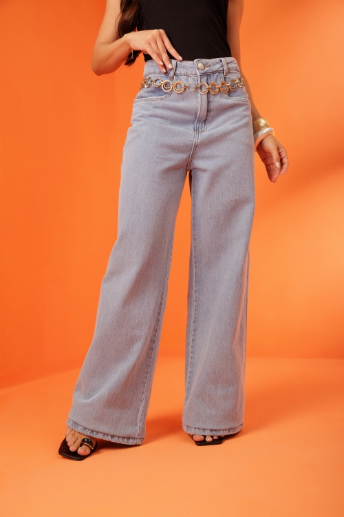 Calça Ísis, cós com passantes e fechamento frontal por botão e zíper. Possui bolsos frontais e posteriores, barra finalizada em bainha e modelagem ampla. Confeccionada em tecido 100% algodão.