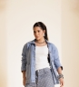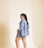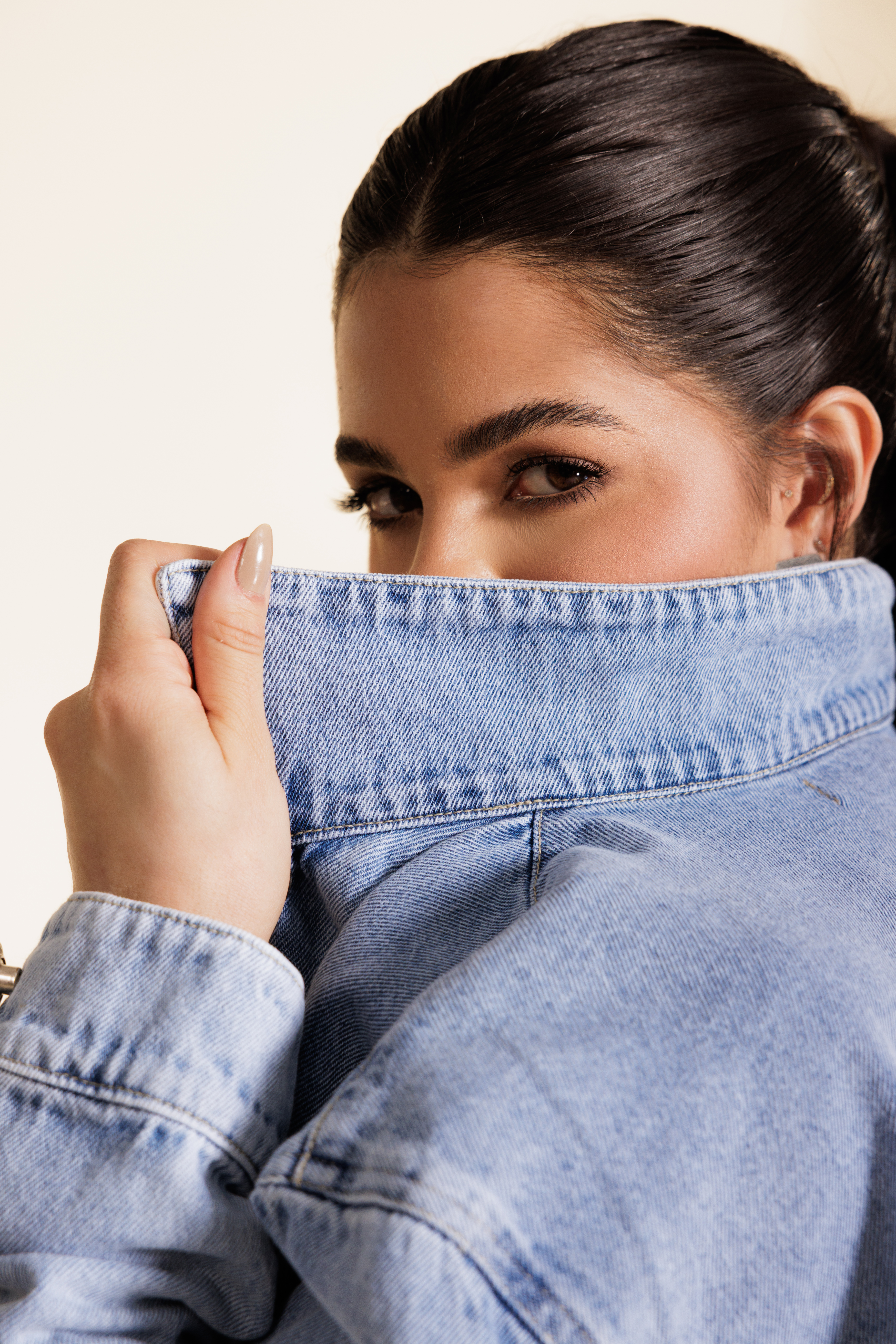 Camisa jeans de lavagem clara, manga longa com punho e botões frontais metálicos. Possui bolsos grandes aplicados na parte inferior.