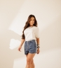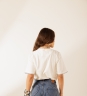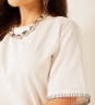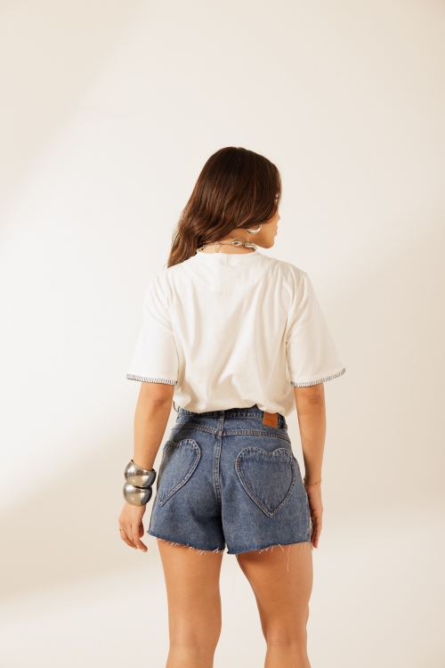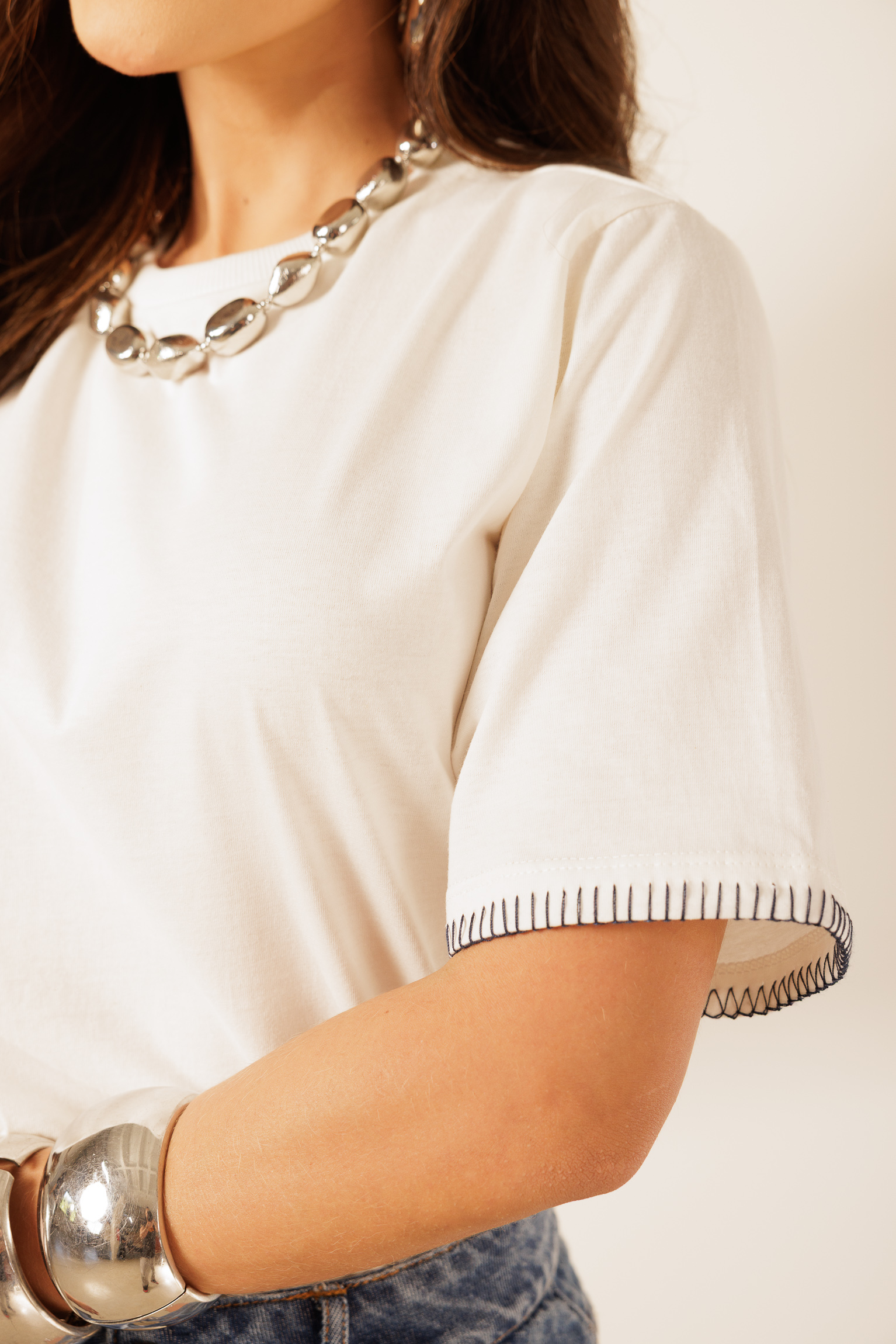 T-Shirt Savana off white com detalhe de ponto palito azul marinho nas mangas. Confeccionada em tecido leve e confortável.
