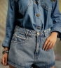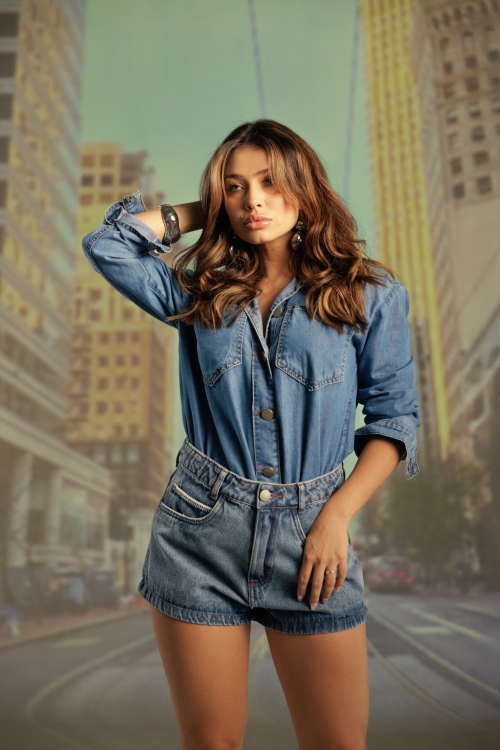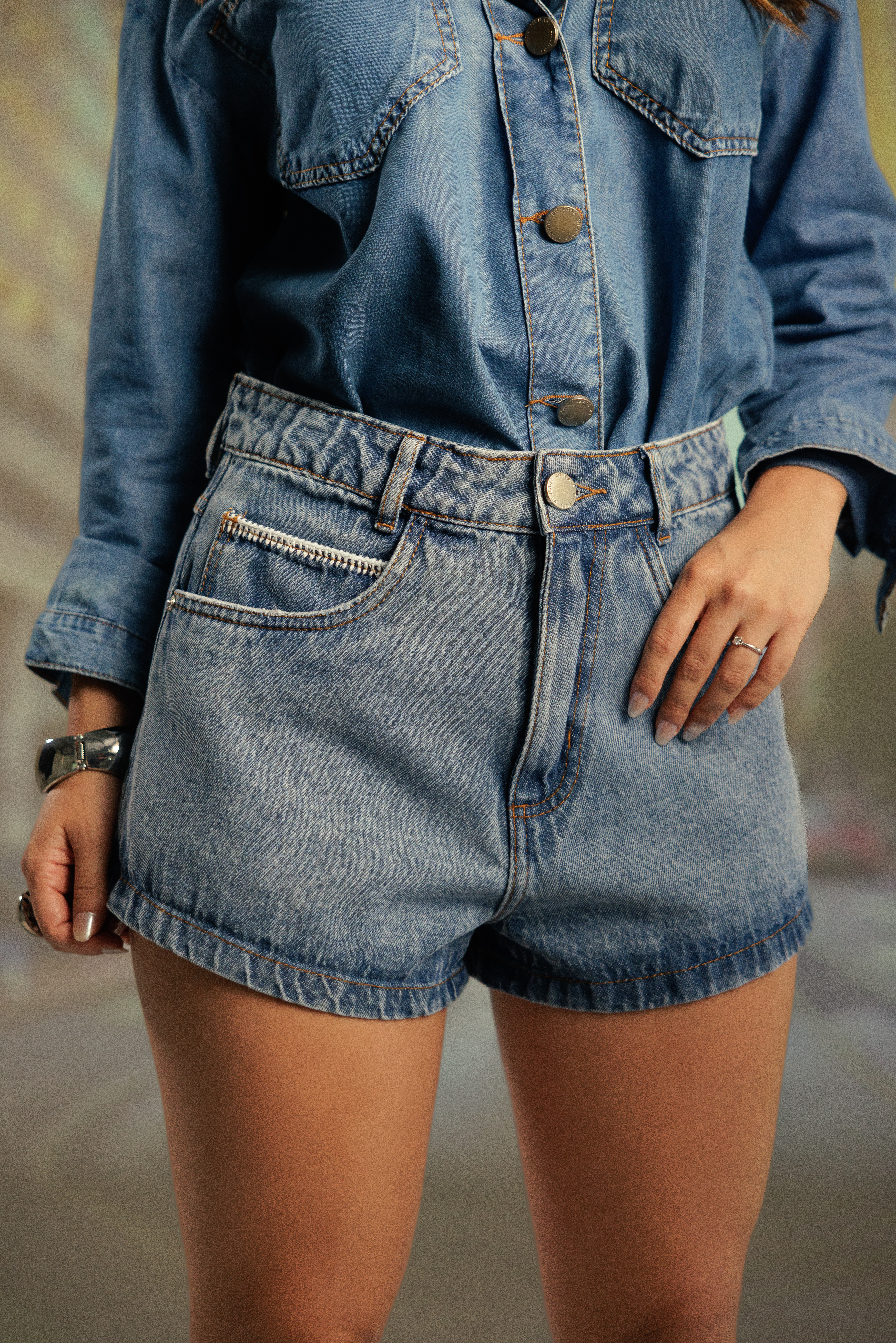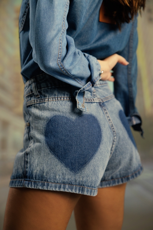 Short Zig com barra levemente em formato asa delta e cós franzido. O bolso relógio traz bordado off white, enquanto a parte de trás tem detalhe de corações em tom contrastante. Confeccionado em tecido 100% algodão.