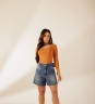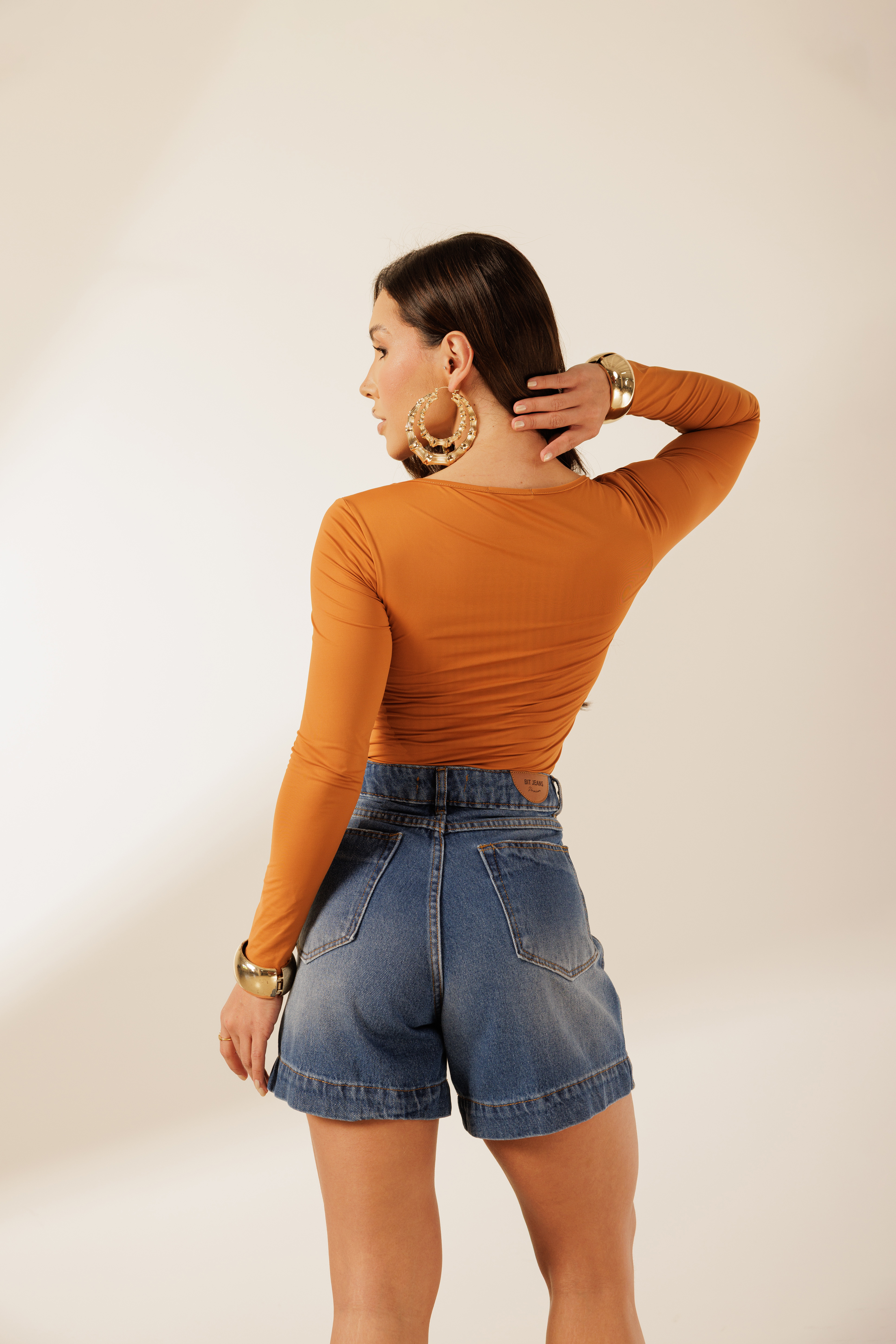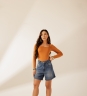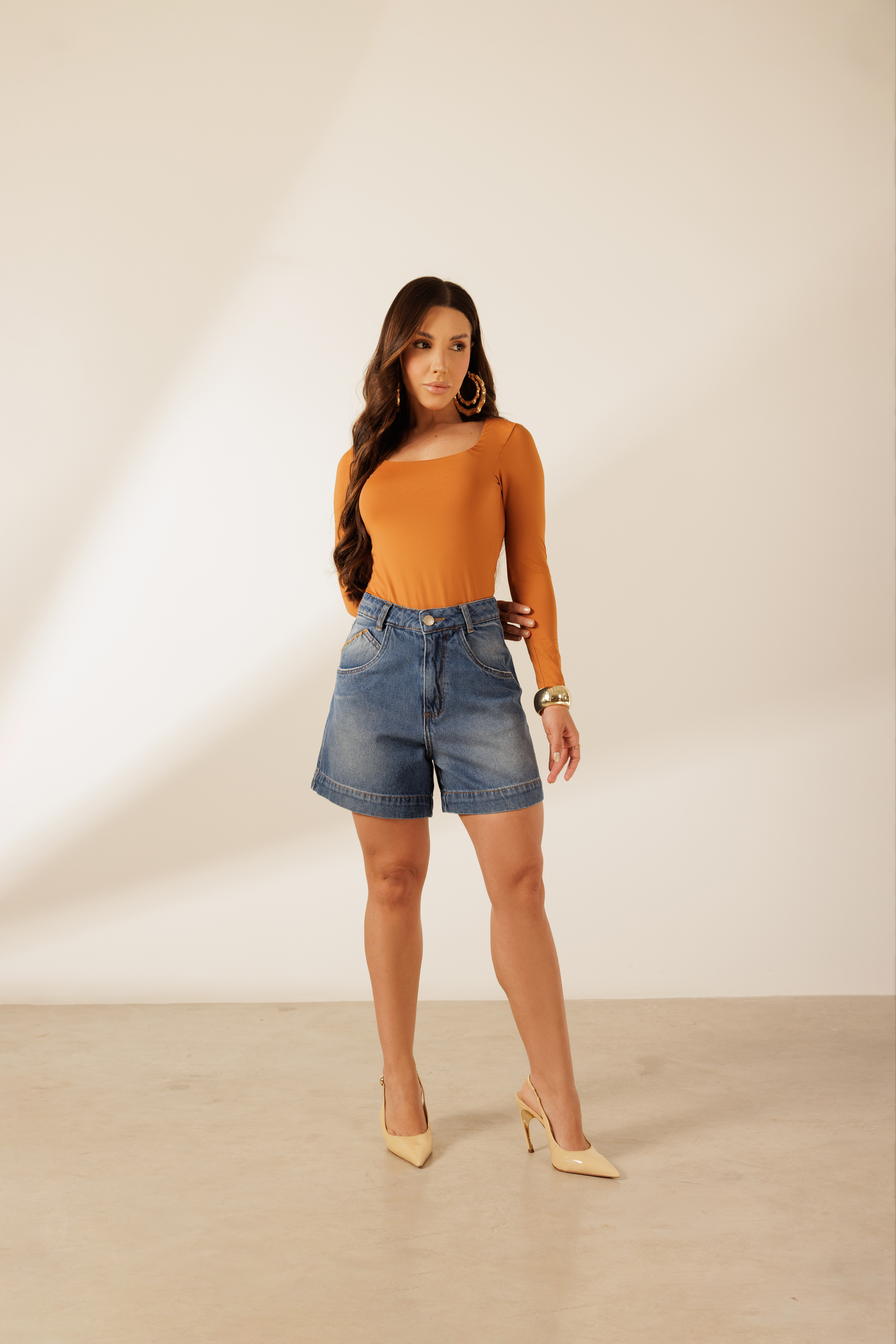 Bermuda Zoe em 100% algodão, comprimento pedal, bolso relógio bordado, cós com passantes e fechamento por botão e zíper.