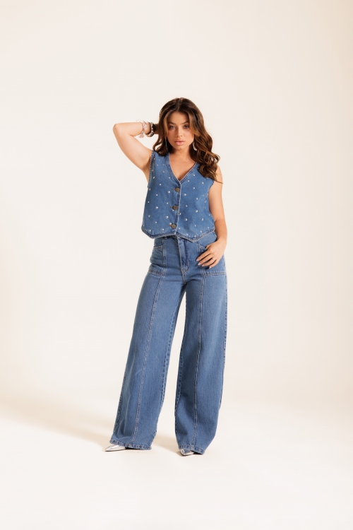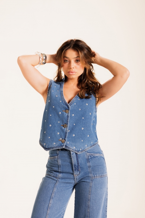 Colete Paola com aplicação de tachas na parte frontal e modelagem moderna. Possui decote em V, fechamento por botões e barra levemente assimétrica. Confeccionado em tecido 100% algodão.