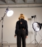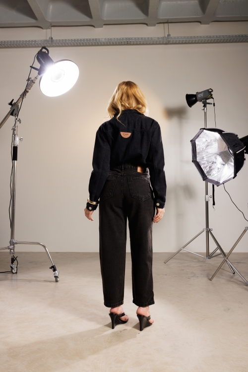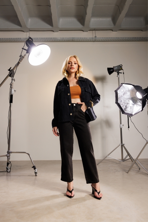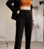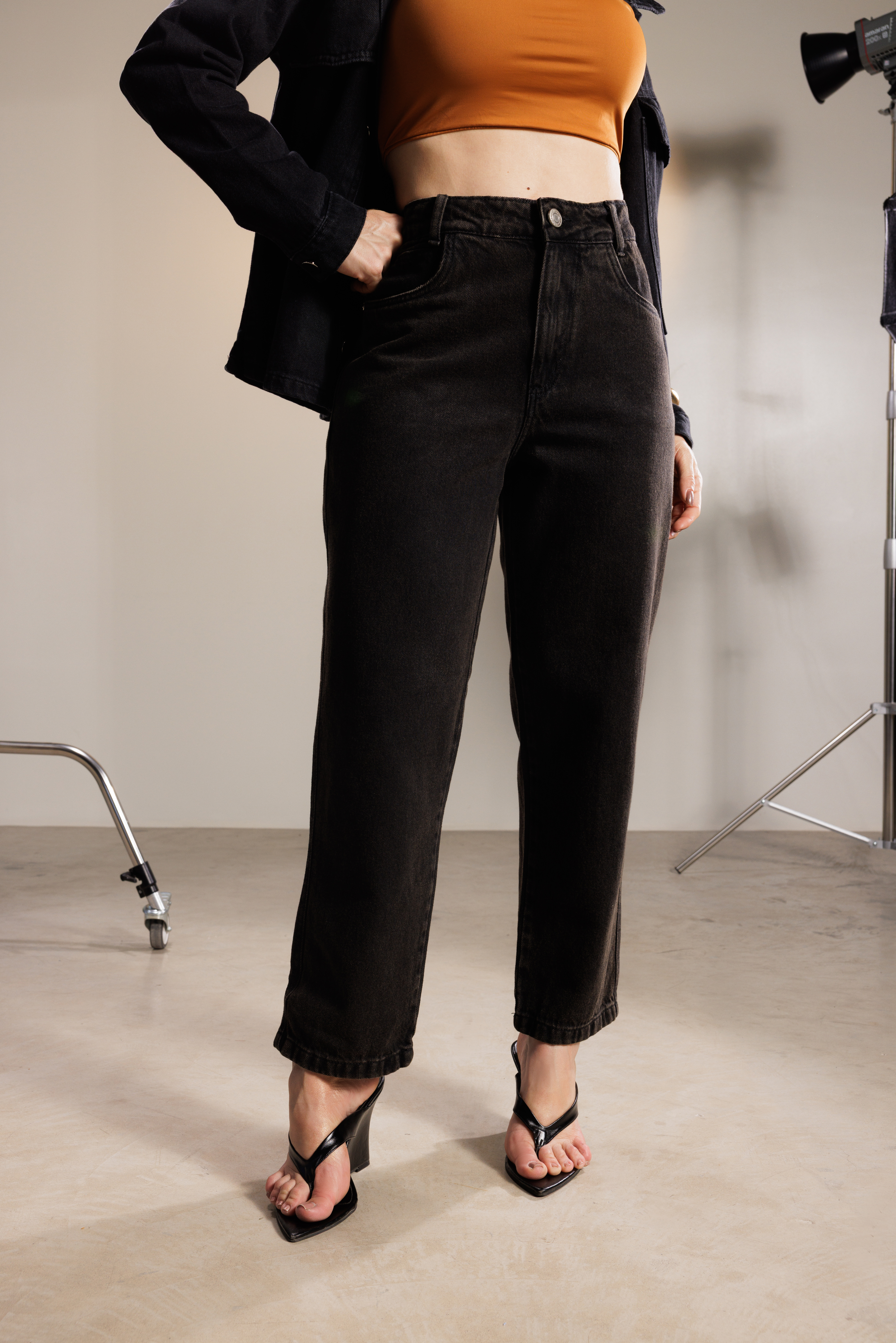 Calça Renata preta em jeans 100% algodão, com cintura alta e caimento mais reto ao longo da perna. Possui bolsos frontais e traseiros, passantes no cós e fechamento por botão e zíper.