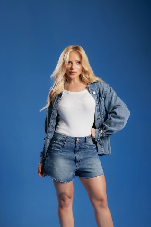 Short Adriana 100% algodão, com bolsos tradicionais frente e costas e lavagem média. Barra desfiada para um acabamento descontraído.