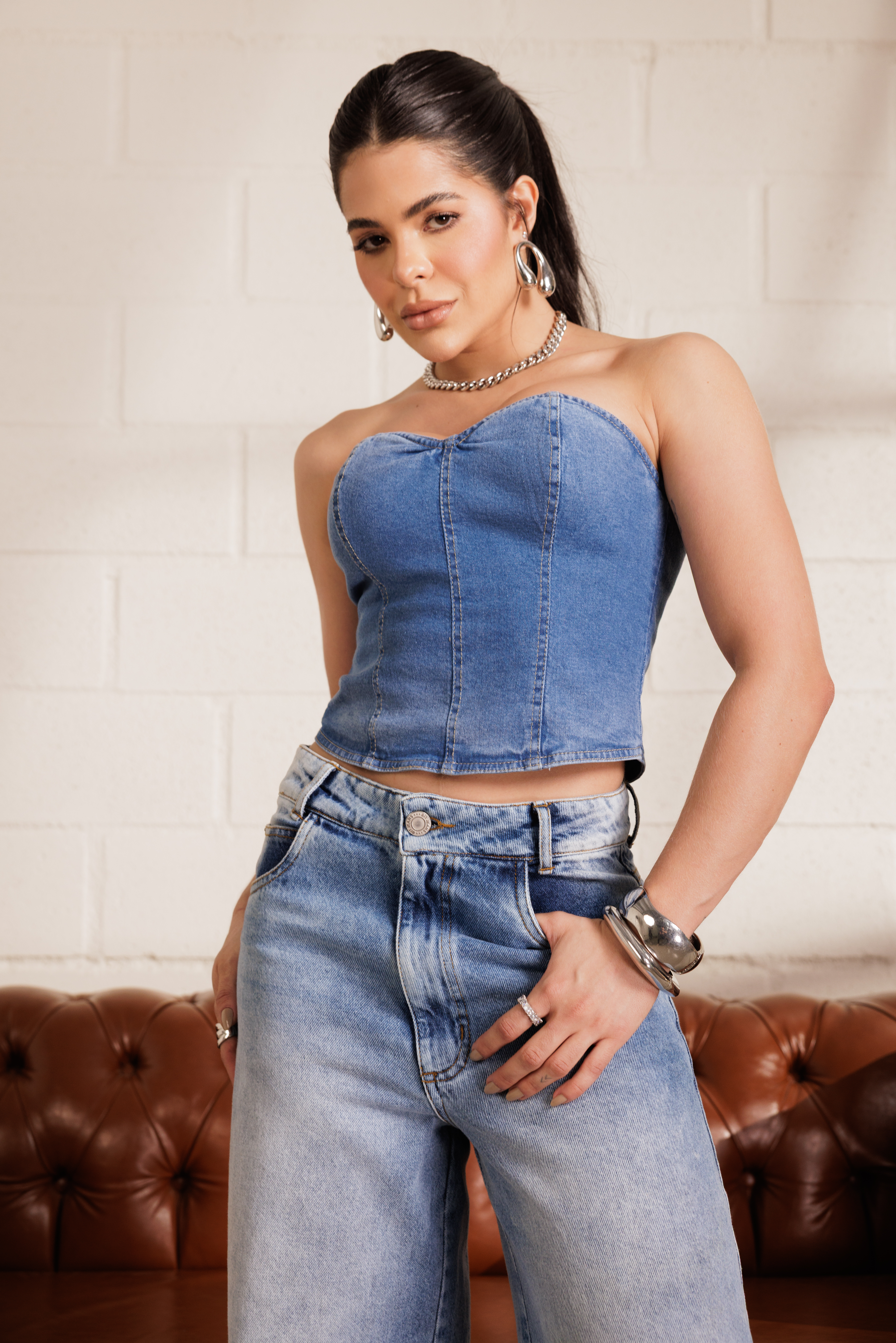 Corset Yana tomara que caia com recortes marcados e leve assimetria na barra. Possui zíper destacável nas costas e shape justo que valoriza o corpo. Um básico nada básico pro look jeans com jeans.