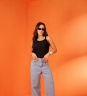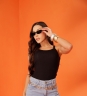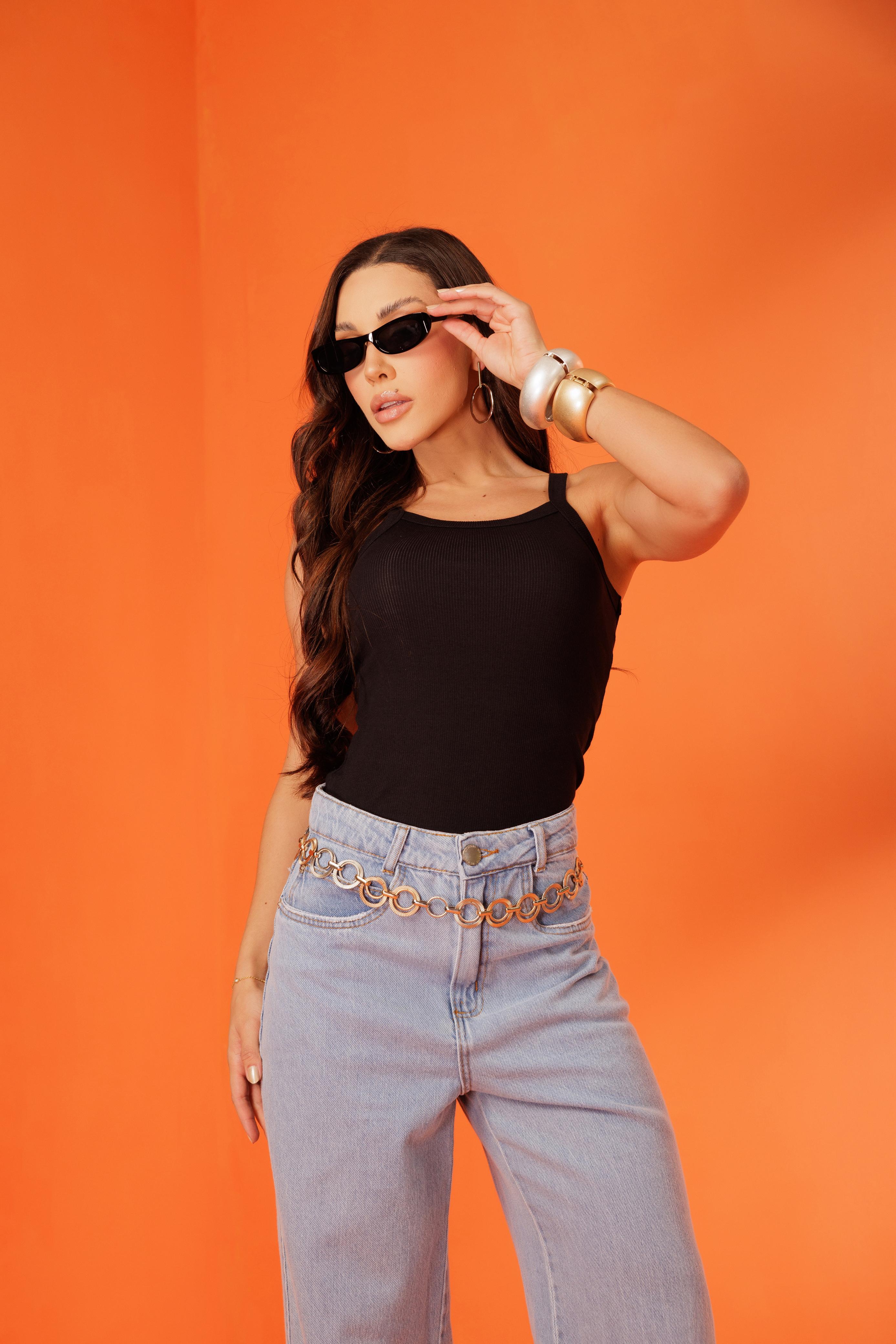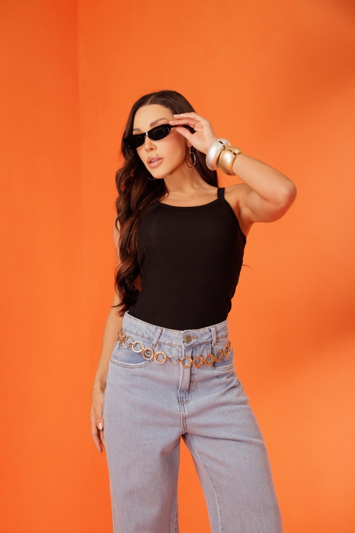 Regata preta em malha canelada, com alças médias e decote levemente arredondado. O modelo é ajustado ao corpo, valorizando a silhueta com conforto.