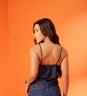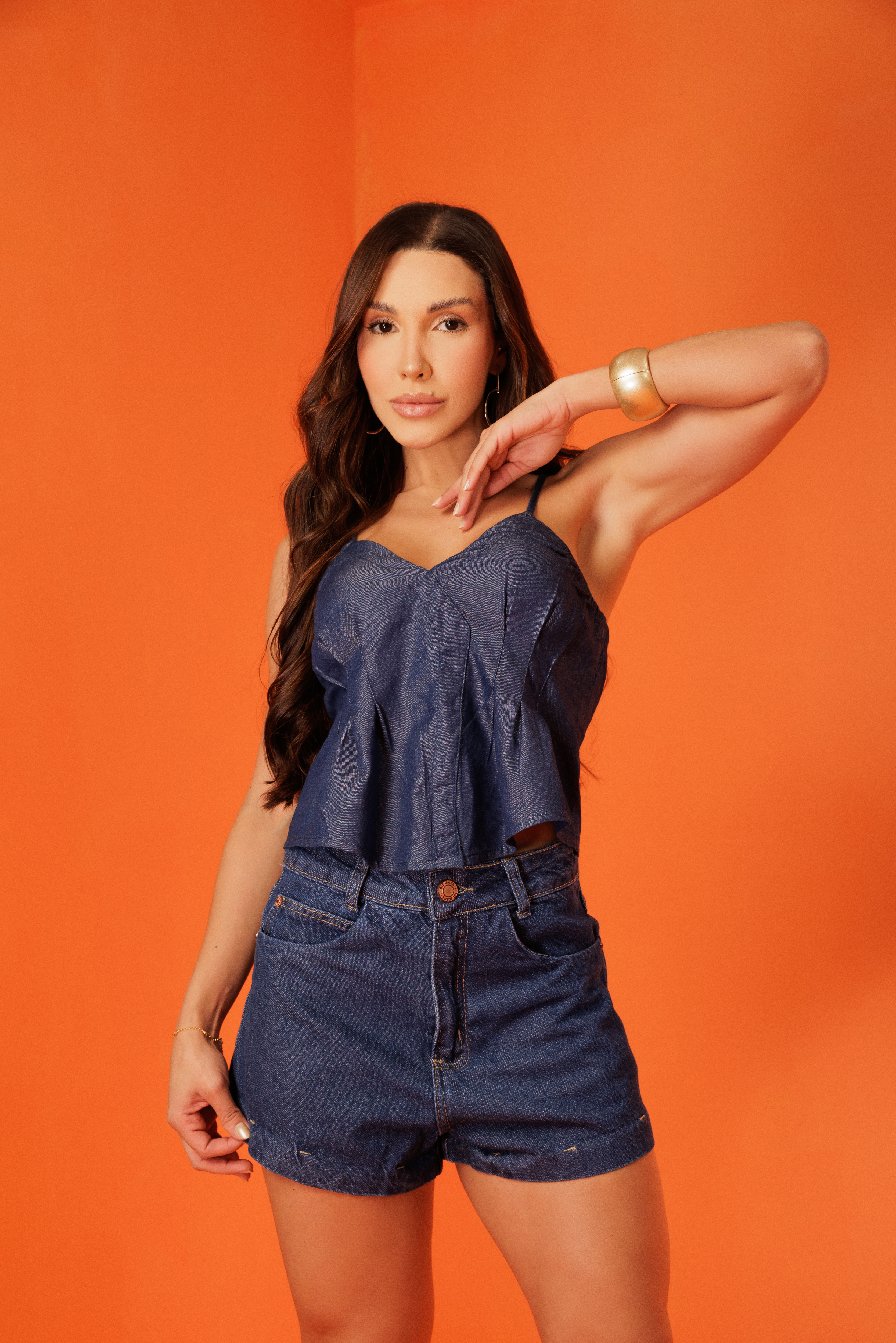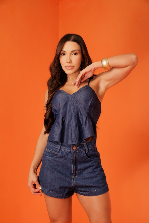 Blusa Candy em tecido jeans leve com alças finas, decote em V e detalhe de pregas no busto. Modelagem soltinha com recortes que valorizam a peça de forma moderna e casual.