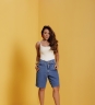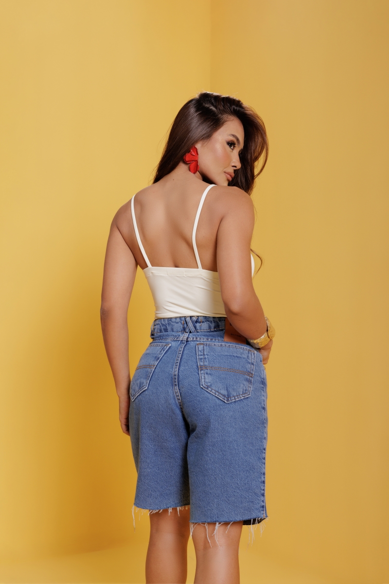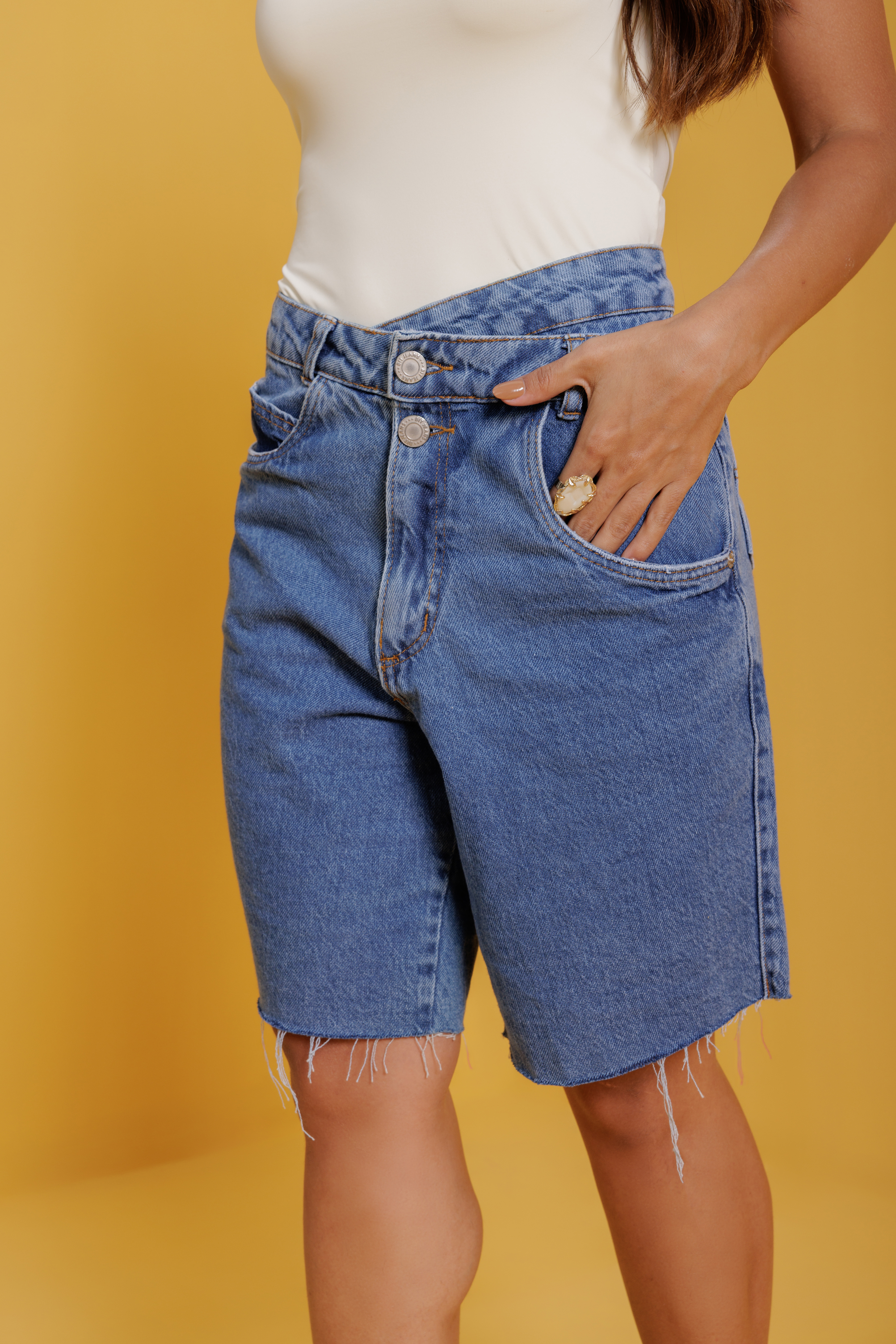 Bermuda Ganz 100% algodão com cós duplo e fechamento por dois botões aparentes. A barra desfiada traz um acabamento despojado que combina com looks casuais.