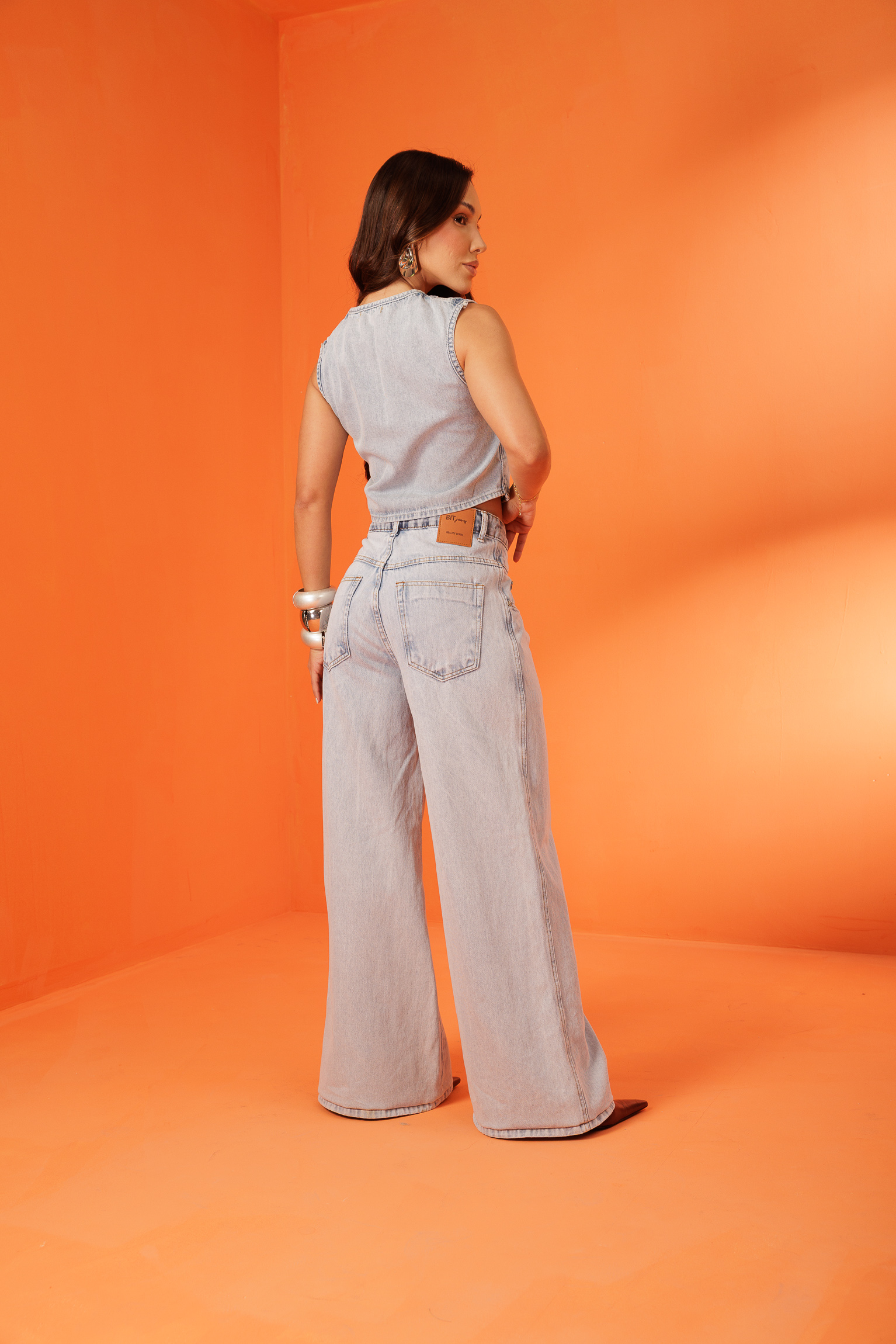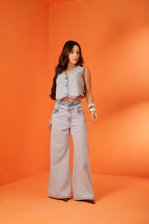 Colete Horus 100% algodão, com decote em V, fechamento frontal por três botões e modelagem com barra assimétrica. Peça em lavagem clara que traz um ar descontraído e atual.
